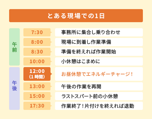 | 勤務時間 | 9:00~17:00 ※現場により異なる(残業が発生する可能性あり) ※夜間勤務あり(手当支給) |