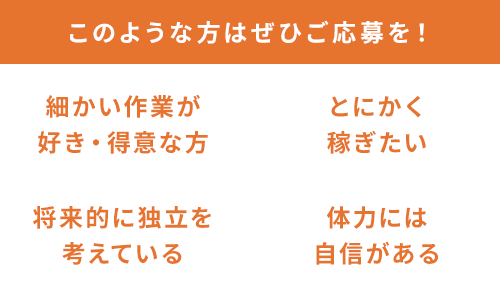未経験の方でも身一つで挑戦できる仕事ですので、ご興味がございましたらお気軽にお問い合わせください。